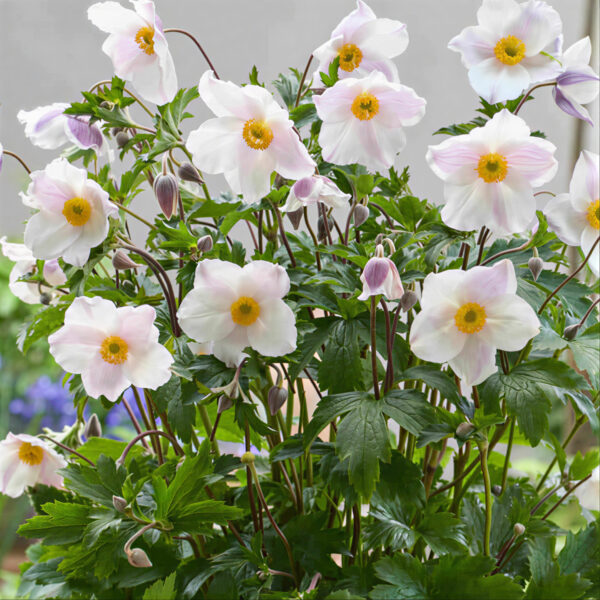 Anemone ‘Dancing Swan’ is a refined late-flowering perennial valued for its calm presence and luminous blooms. From midsummer into autumn, tall stems carry open white flowers above a dense base of green foliage, bringing clarity and contrast to the garden as many plants begin to fade. The petals show a delicate wash of pale lilac on the underside, adding subtle interest when the flowers move in changing light. Its upright, open habit makes it ideal for adding height without bulk, working well among grasses, shrubs, or mixed perennial planting. Particularly effective in lightly shaded borders, it also supports pollinating insects and provides reliable colour through the closing weeks of the growing season.