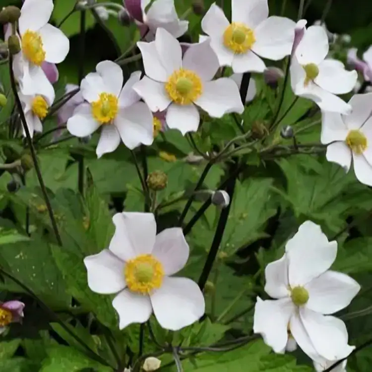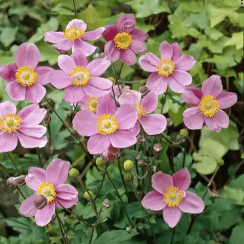 Anemone × hybrida ‘September Charm’ is a stunning late summer and autumn bloomer that adds vibrant colour to the garden. With masses of large, pink, cup-shaped flowers and green foliage, it serves as an attractive feature. To promote extended blooming, deadhead once the initial flowering phase concludes. This variety is a magnet for bees and butterflies. While hardy, it may require protection in the event of severe frost.