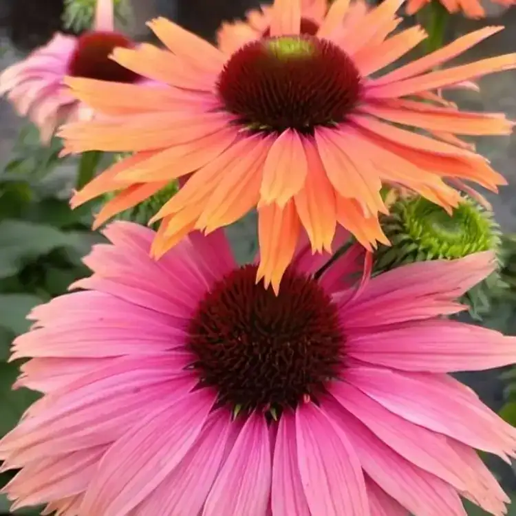 Echinacea SunSeekers ‘Rainbow’ is a compact perennial that delights the eye with its cheerful yellow-pink blooms, which gradually deepen to a richer pink as the season progresses. Blooming from mid-summer through to early autumn, its vibrant flowers bring long-lasting colour to sunny borders, mixed beds, and container plantings, adding interest and movement to garden displays.