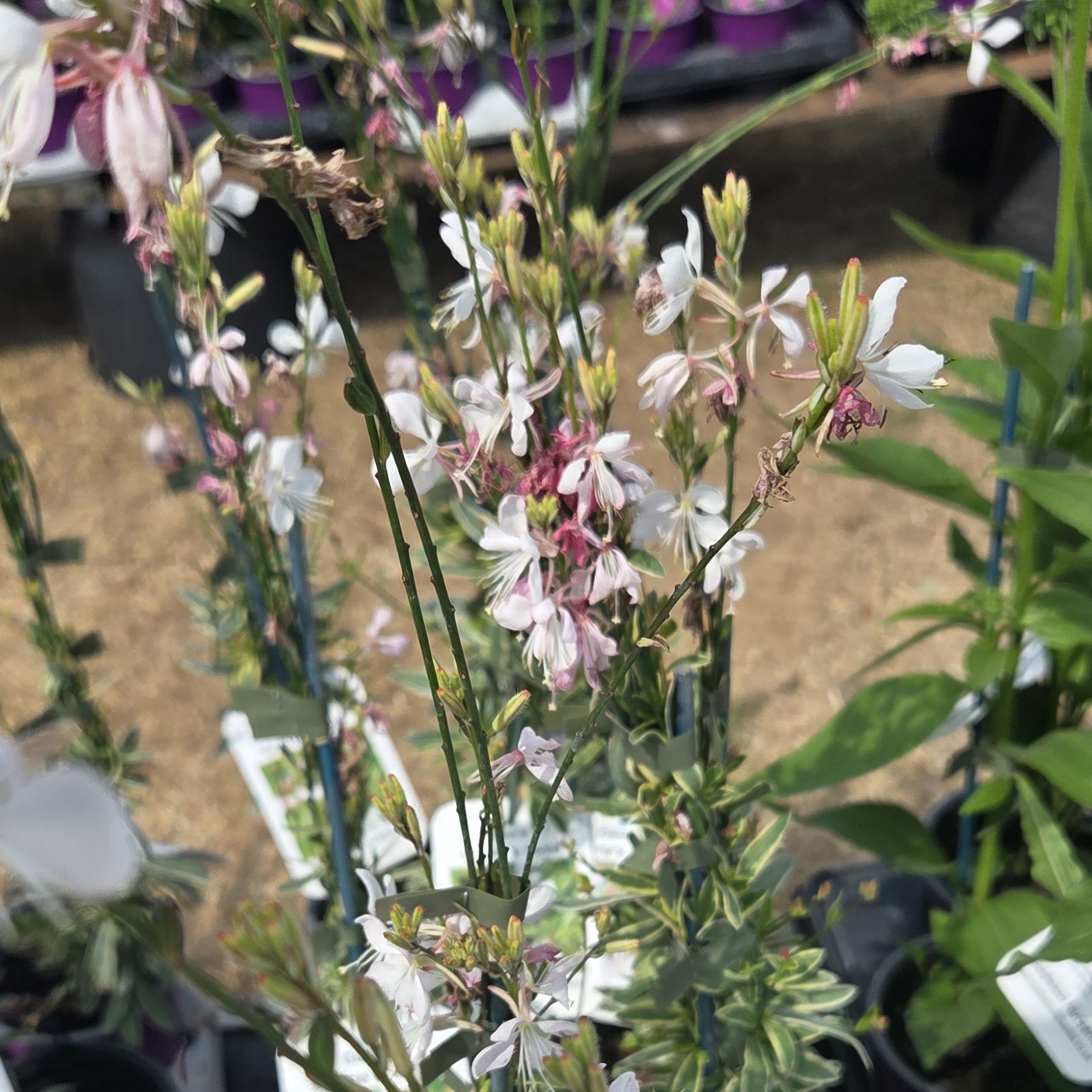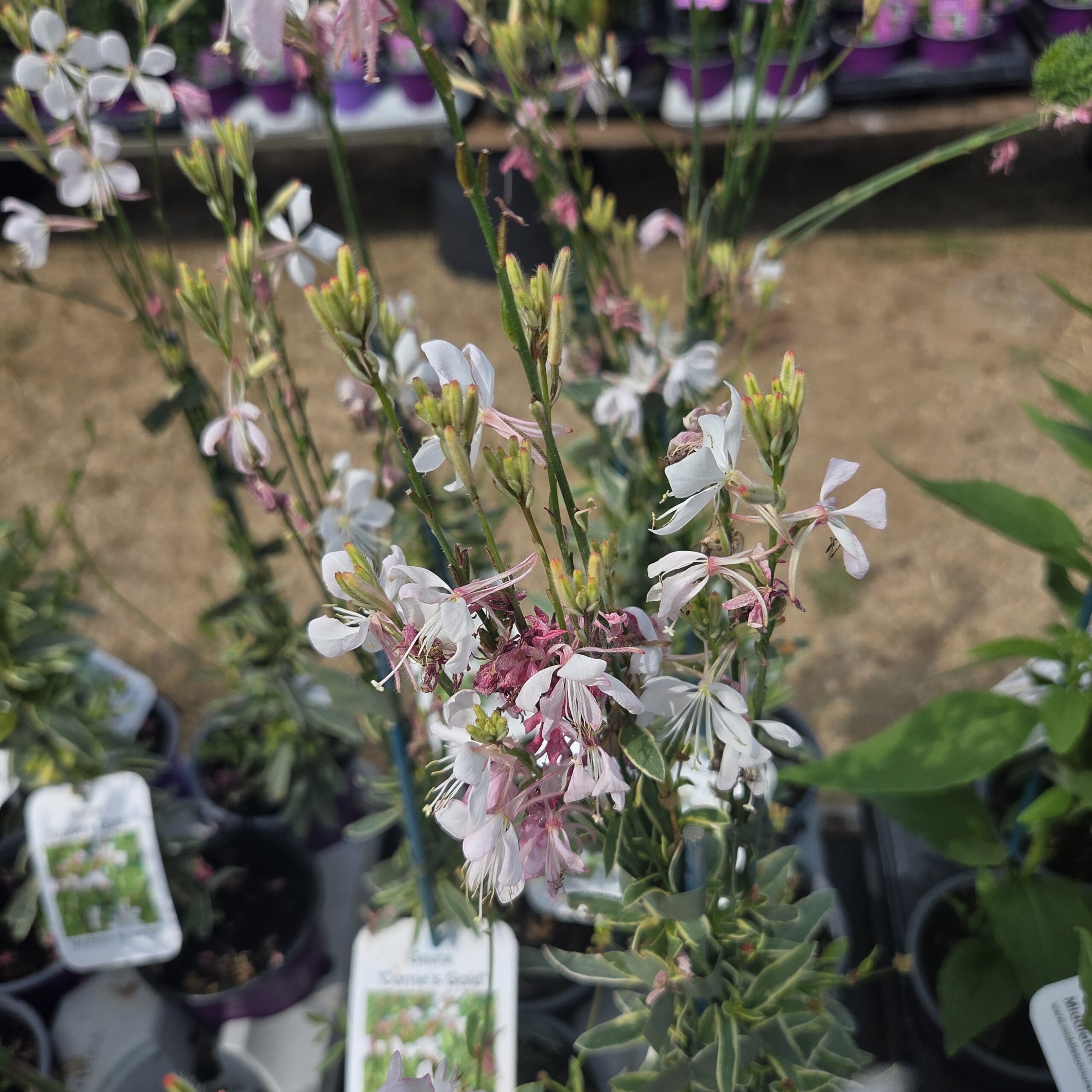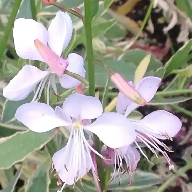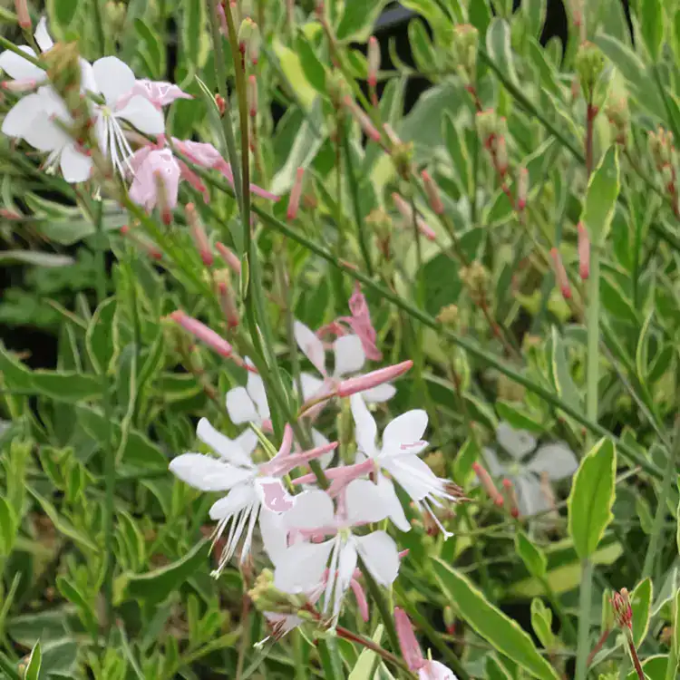 Gaura lindheimeri ‘Corrie’s Gold’ is a stunning perennial that brings delicate beauty to your garden. With its striking variegated foliage and exquisite pink/ white flowers, it graces your space from early spring through the fall. A magnet for bees and butterflies thanks to its nectar-rich blossoms, this salvia thrives in full sun and well-drained soil. Resilient in the face of drought, heat, and humidity, it does require protection in severe frost conditions.