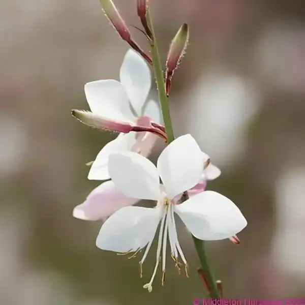 Gaura lindheimeri ‘Flamingo White’ is a stunning perennial that adds delicate beauty to your garden. Adorned with green foliage and exquisite pink/white flowers, it graces your space from early spring through the fall. A magnet for bees and butterflies, thanks to its nectar-rich blossoms, this Gaura thrives in full sun and well-drained soil. Resilient in the face of drought, heat, and humidity, it does require protection in severe frost conditions.