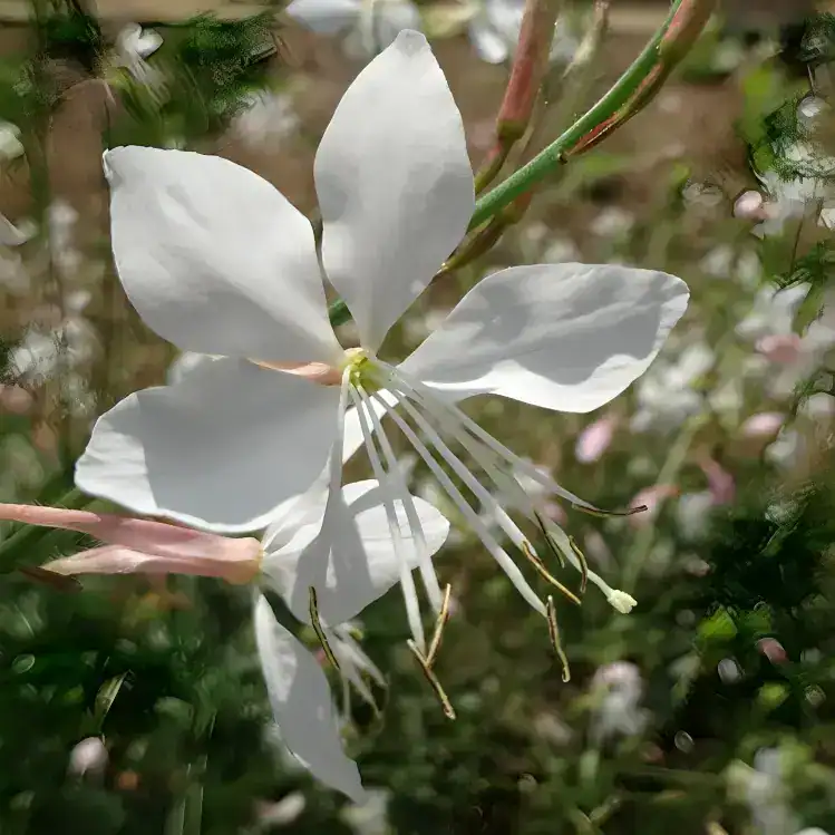 Gaura lindheimeri ‘Graceful White’ is a captivating clump-forming plant featuring lush green foliage and delicate white flowers that bloom from early summer to mid-autumn. Well-suited for both pots and borders, it proves to be an excellent choice for attracting bees to your garden. To encourage continuous blooming, deadheading is recommended once the initial flowering phase concludes. This hardy plant requires protection only in the event of very severe frost.