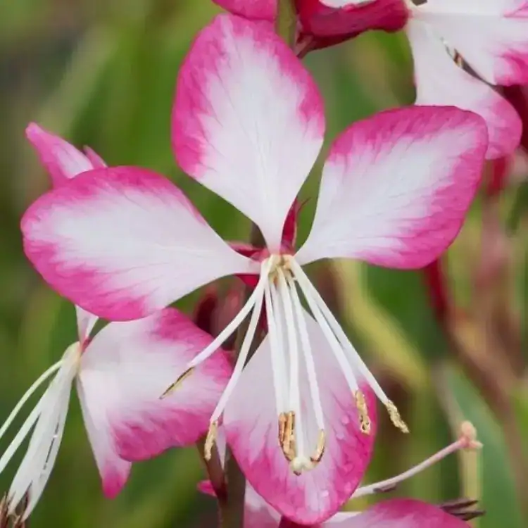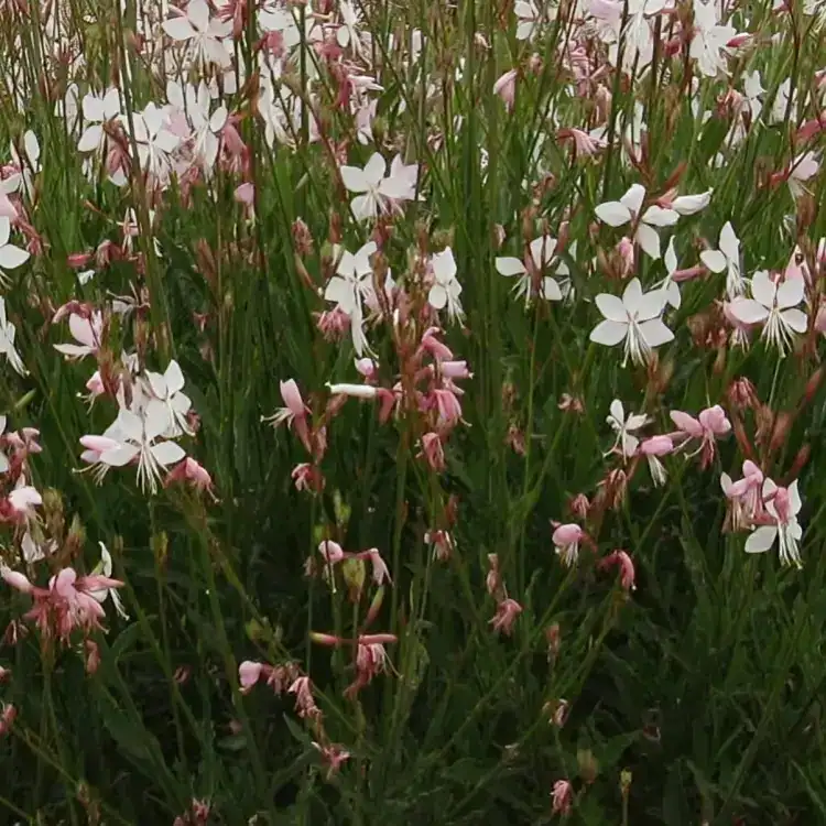 Gaura lindheimeri ‘RosyJane’ is a striking clump-forming plant with green foliage and delicate white flowers that grace the garden from early summer to mid-autumn. Ideal for both pots and borders, it proves attractive to bees. To promote prolonged blooming, deadhead once the initial flowering phase concludes. This hardy plant requires protection only in the presence of very severe frost.