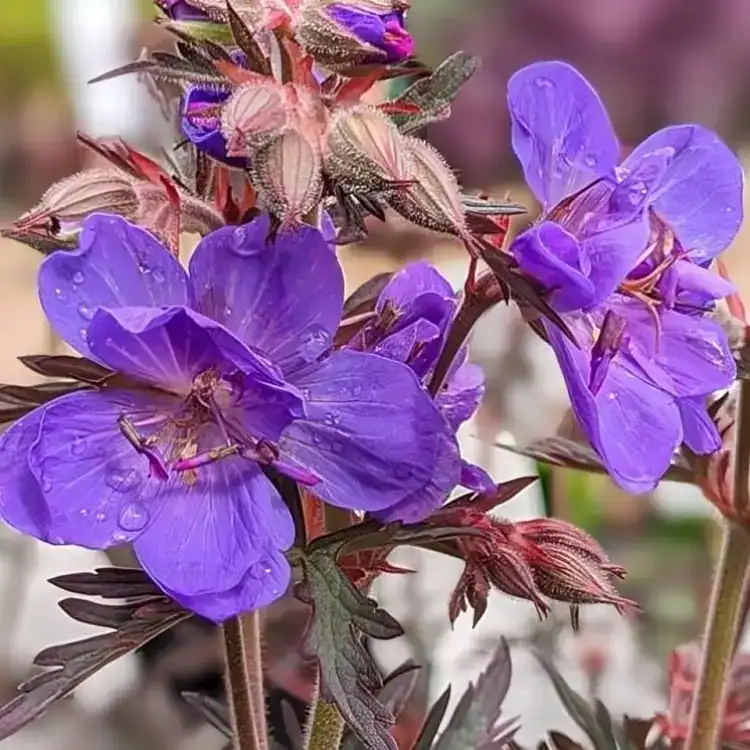 Geranium ‘Storm Cloud’ exhibits a compact, bushy habit, yielding clusters of purple flowers. The blooming period initiates in late spring and extends through late summer. To prolong flowering, it is recommended to deadhead once the initial blooming phase concludes. This variety thrives in borders and wildlife gardens, where its vibrant flowers contribute to attracting pollinating insects. While hardy, caution is advised, and protection may be necessary in the event of severe frost.