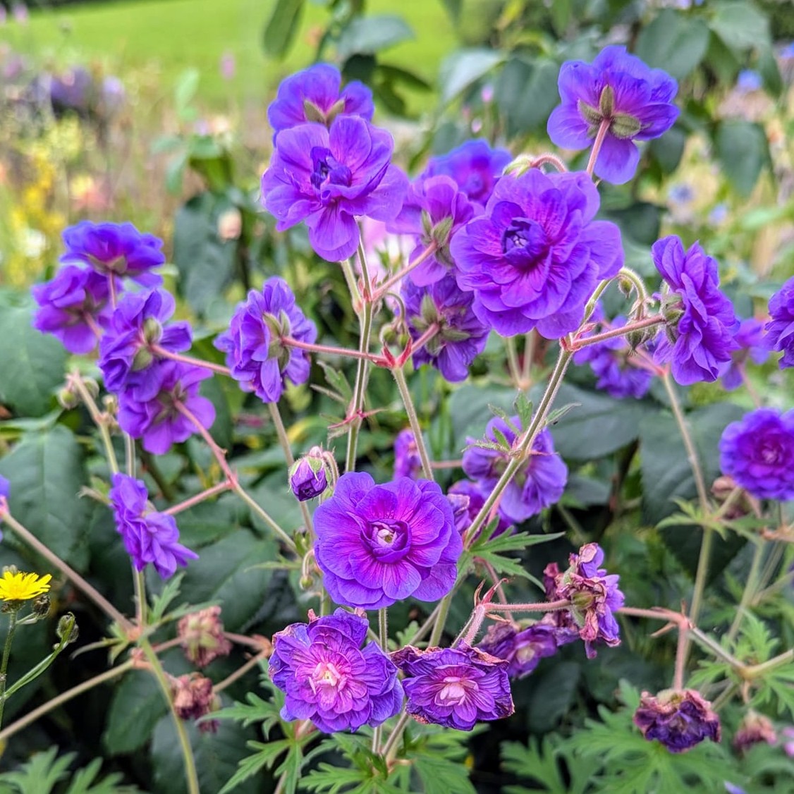 Geranium pratense ‘Plenum Violaceum’ is a stunning hardy perennial, valued for its rich violet-blue, fully double flowers that bloom from late spring into summer. Its finely divided green foliage forms a tidy mound, providing an attractive backdrop for the abundant flowers and a natural, relaxed structure in borders or mixed perennial beds. Highly resilient and low-maintenance, it thrives in full sun to partial shade with well-drained soil, making it perfect for cottage gardens, wildlife-friendly plantings, or naturalistic schemes. A long-flowering and reliable perennial that adds colour, texture, and charm to the garden.