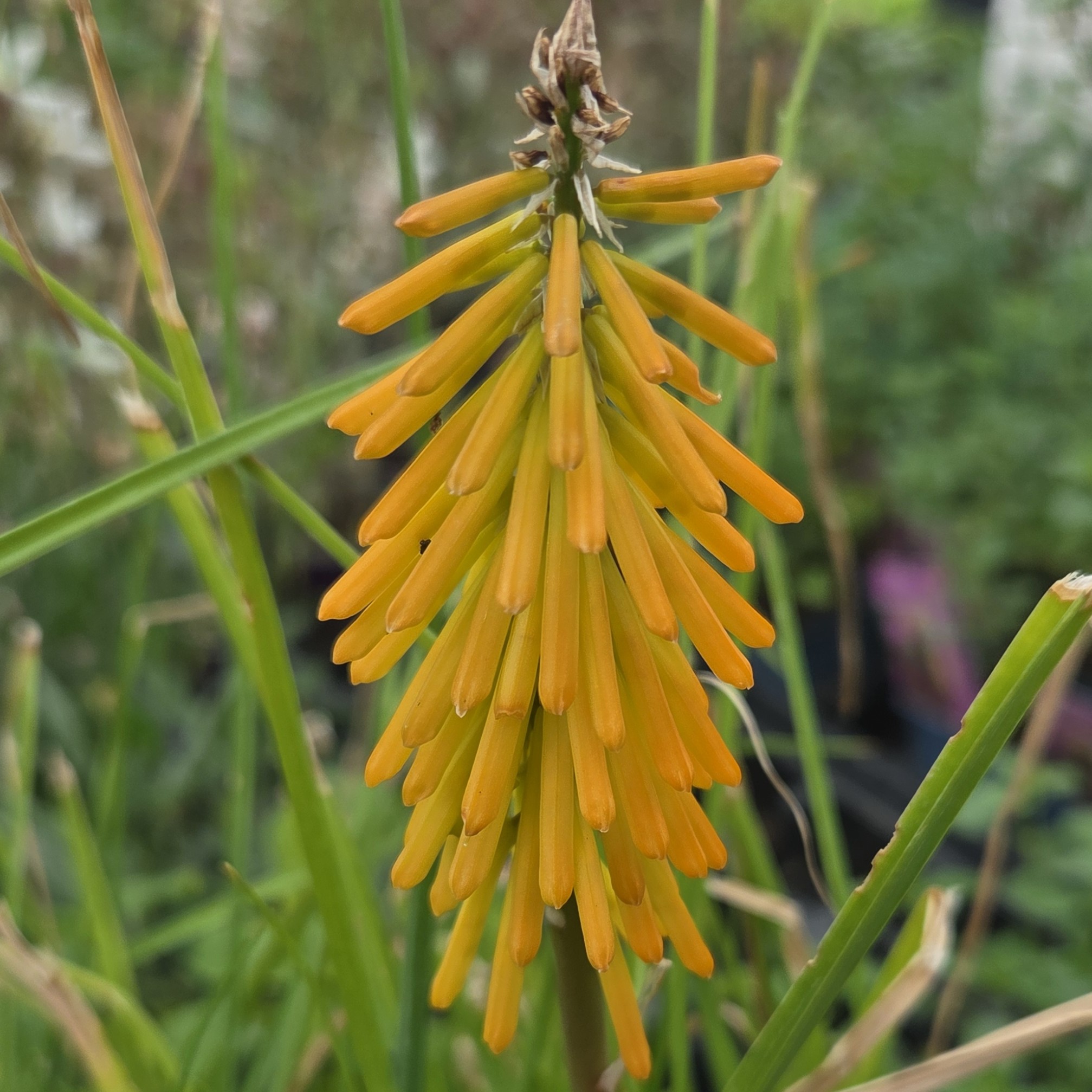 Kniphofia ‘Happy Halloween’ is effortlessly cultivated, thriving when planted in well-drained soil, particularly during winter. This variety produces abundant yellow flowers, blooming throughout the summer. It is well-suited for the front of the border or for planting in pots and containers.