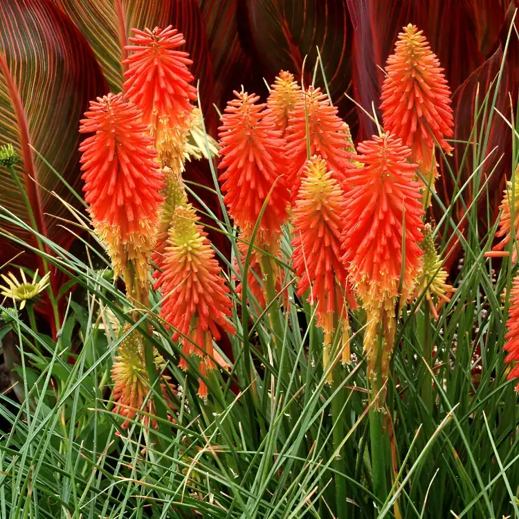 Kniphofia ‘Papaya Popsicle’ has grassy, evergreen leaves and produces reddy orange flowers that blooms from early summer to late summer. Perfect for the front of the border or for planting in pots and containers. Plant in well-drained soil that gets sun or part shade. Drought tolerant, once established.