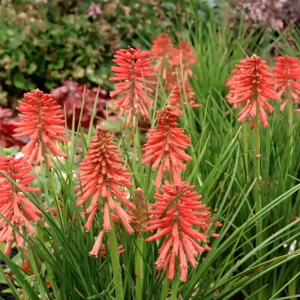 Kniphofia ‘Poco Red’ ‘ features slender, evergreen leaves and produces striking red flowers that bloom from early to late summer. Ideal for the front of the border or container planting, it thrives in well-drained soil under sun or part shade. Once established, it demonstrates drought tolerance. This variety was introduced in 2010 by Terra Nova Nurseries of Oregon.