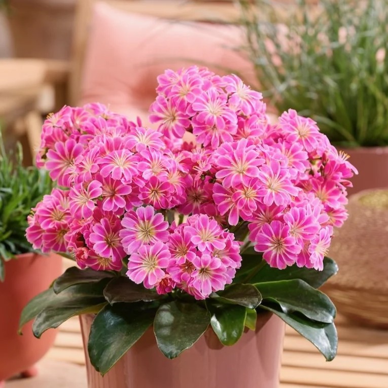 Lewisia Safira™ ‘Tropic Pink’ is a striking evergreen perennial valued for its vivid, hot pink flowers that glow against neat rosettes of glossy, dark green foliage. Blooming generously from spring into early summer, and often with repeat flowers later in the season, it brings bold colour to rock gardens, alpine beds and containers. This compact plant thrives in full sun or light shade and requires sharply drained, gritty soil to perform well. Once established, it is drought tolerant and low maintenance, making Lewisia Safira™ ‘Tropic Pink’ an excellent choice for adding intense colour to small spaces and patio displays.