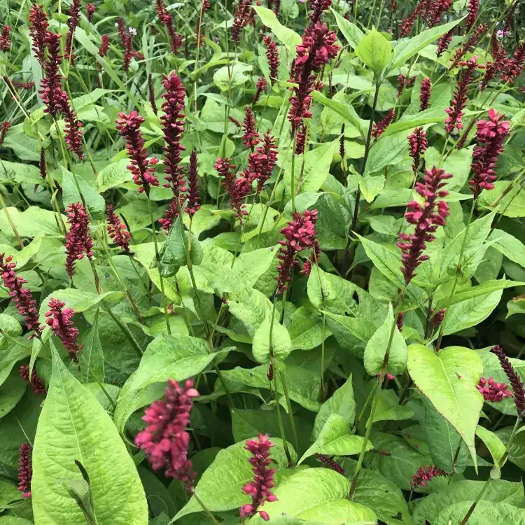 Persicaria amplexicaulis ‘Red Baron’ is a prolific bloomer, showcasing masses of appealing red flowers from early summer through autumn. Its vibrant blossoms make it a magnet for bees and butterflies, contributing to the lively atmosphere of your garden. Notably, it is not known to attract deer, and rabbits tend to avoid it. While generally hardy, it is advisable to provide protection during severe frost conditions to ensure its continued well-being and blooming success. This perennial adds both visual allure and ecological value to your outdoor space.