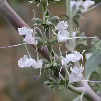 Salvia ‘Apiana’, commonly known as White Sage or Sacred Sage, features striking silvery foliage with a velvety texture, thanks to its fine, soft hairs. It also produces tall, tubular flower spikes in delicate shades of white/pale lavender. This elegant plant is a perfect choice for borders or gravel gardens, adding both texture and a touch of colour.