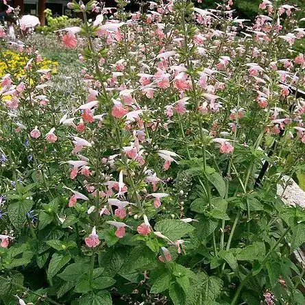 Producing arched tube-shaped flower heads of pale coral-pink, Salvia ‘Coral Nymph’ is a beautiful variety to opt for. These beautiful blooms rise gracefully above the heart-shaped bushy green foliage, creating a striking contrast and infusing your garden with a bold, luminous touch. Its neat growth habit and heavy blooming nature enhance the beauty of its showy flower spikes, making it a standout addition to any landscape.
