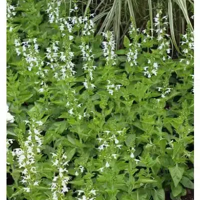 Producing arched tube-shaped flower heads of pure white, Salvia ‘Snow Nymph’ is a beautiful variety to opt for. These beautiful blooms rise gracefully above the bushy green foliage, creating a striking contrast and infusing your garden with a bold, luminous touch. Its neat growth habit and heavy blooming nature enhance the beauty of its showy flower spikes, making it a standout addition to any landscape.