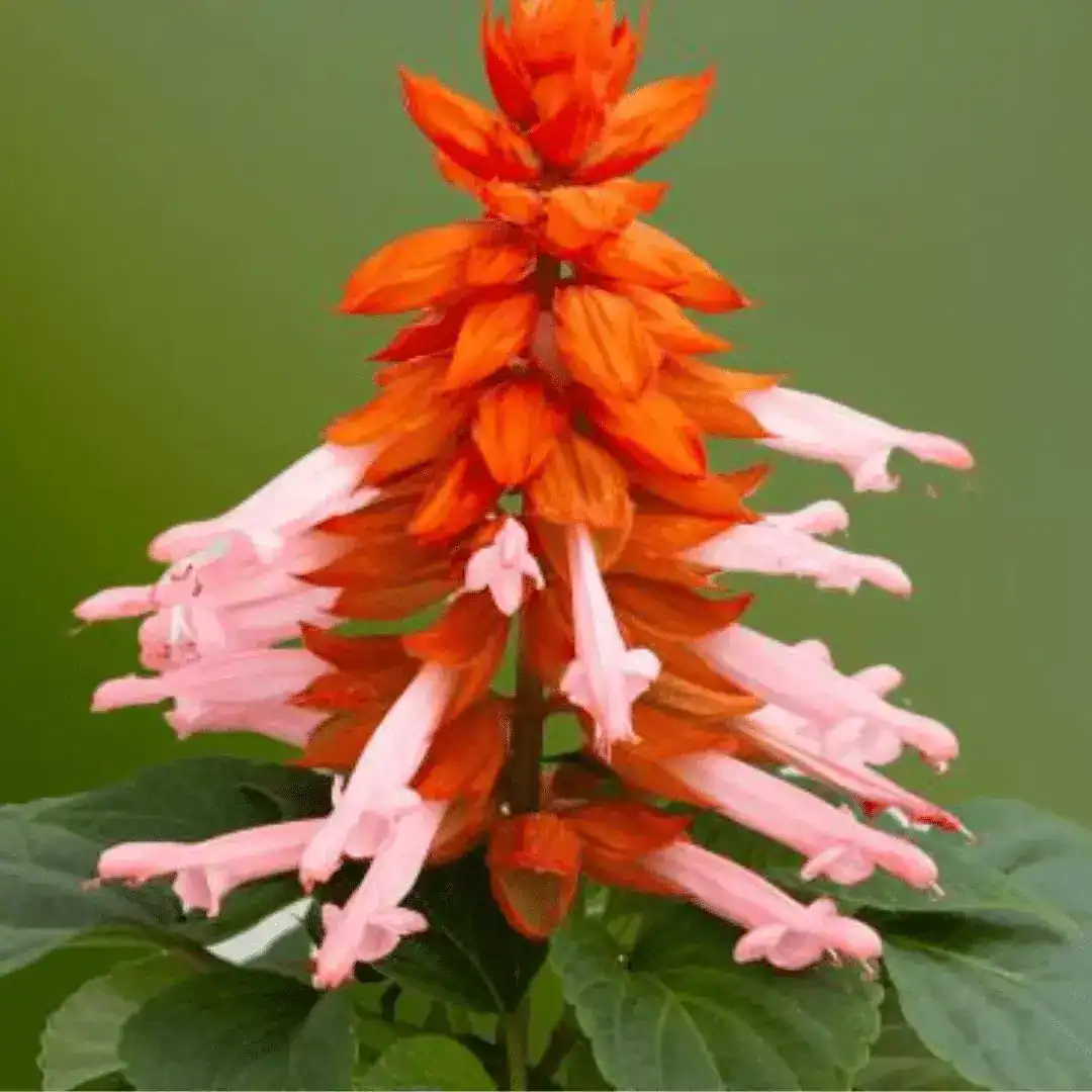 Salvia splendens ‘Mojave Salmon’ is a compact, early flowering, dwarf annual variety that stands out for its striking beauty. Great variety from the splendens collection due to it’s excellent heat-tolerance, branching and repeat flowering. It features aromatic, oval-shaped green leaves that provide a rich, textured backdrop to its vibrant, tubular red/light pink shaded flowers, which bloom profusely throughout the growing season.This variety flourishes in full sun, making it an ideal choice for sunny borders, patios, and a variety of garden settings.