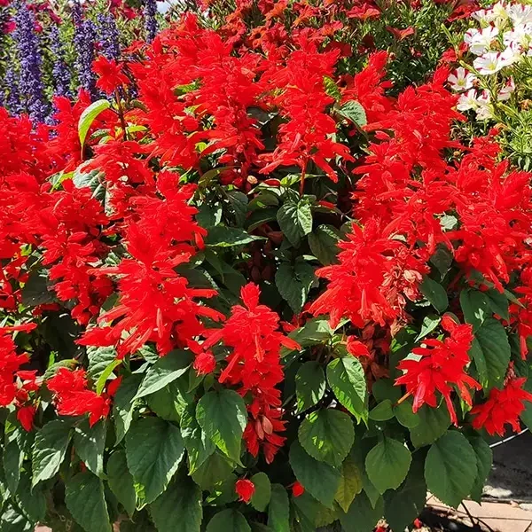 Salvia splendens ‘Red Hill’ is a compact, upright annual variety that stands out for its striking beauty and robust performance. It features aromatic, oval-shaped green leaves that provide a rich, textured backdrop to its vibrant, tubular red flowers, which bloom profusely throughout the growing season. This variety is particularly valued for its versatility, thriving in both full sun and partial shade, making it an excellent choice for various garden settings. Salvia ‘Red Hill’ brings a bold pop of colour to any landscape.