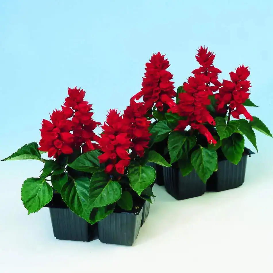 Salvia splendens ‘Reddy Bright Red’ is a compact, early flowering, dwarf annual variety that stands out for its striking beauty. It features aromatic, oval-shaped green leaves that provide a rich, textured backdrop to its vibrant, tubular red shaded flowers, which bloom profusely throughout the growing season.This variety flourishes in full sun, making it an ideal choice for sunny borders, patios, and a variety of garden settings. Salvia ‘Reddy bright Red’ will always add a bold splash of colour to any landscape with its vibrant flower heads.