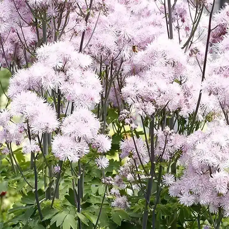 Thalictrum aquilegifolium ‘Nimbus Pink’ is a wonderful plant known for producing a stunning mass of purple flowers that bloom from early summer to the end of autumn. Winter-hardy, this perennial gracefully dies back underground in the autumn, only to burst into life again each spring. The captivating purple blooms of ‘Nimbus Pink’ not only add aesthetic appeal to your garden but also make it a favorite among bees, contributing to the pollinator-friendly environment. With its enduring beauty and resilience, ‘Nimbus Pink’ adds both charm and ecological value to your outdoor space, creating a vibrant and lively garden throughout the growing season.