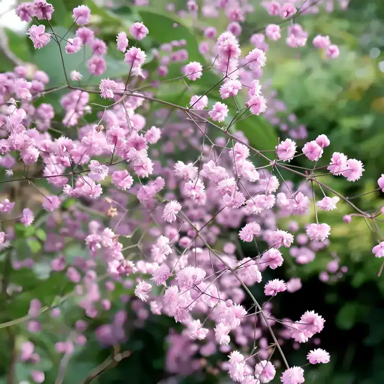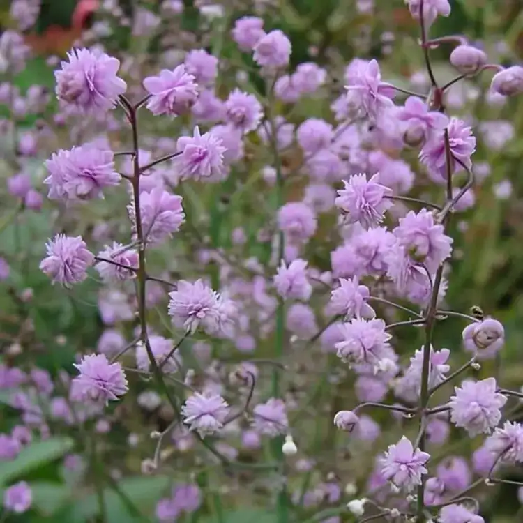 Thalictrum delavayi ‘Hewitt’s Double’ showcases stunning lilac-purple double flowers and features a tall and narrow habit, making it an ideal choice for borders and wildlife gardens. The richly coloured flowers of this variety are attractive to pollinating insects, though staking is typically required for support. ‘Hewitt’s Double’ is hardy and generally needs protection only during severe winters. With its captivating double blooms and suitability for attracting pollinators, this Thalictrum variety adds both beauty and ecological value to your garden, making it a valuable addition to various outdoor settings.