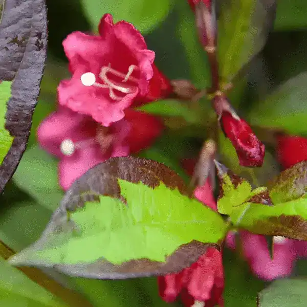 Weigela ‘Camouflage’ is a deciduous shrub distinguished by its impressively extended flowering season. Highlighted by a combination of green and black foliage, complemented by charming pink bell-shaped flowers, this variety exhibits a tolerance for some shade. However, to unveil its most vibrant display, it flourishes best when planted in a sunny location. With notable hardiness, ‘Camouflage’ assures lasting beauty and a diverse tapestry of colours throughout the entire growing season.
